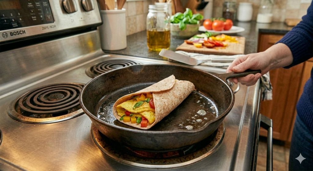 אפשר לחמם קלות את הטורטיה על מחבת יבשה לפני המילוי.