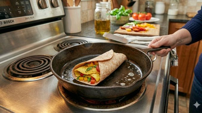 מניחים את המקושקשת במרכז הטורטיה, מגלגלים ומגישים.